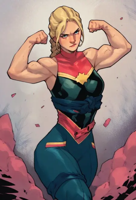 Tags > 1girl, cmarvel, blonde hair, braid, suit, sleeveless, fingerless gloves, gloves, muscular female