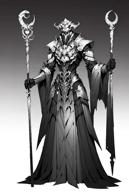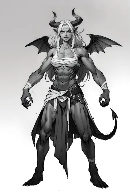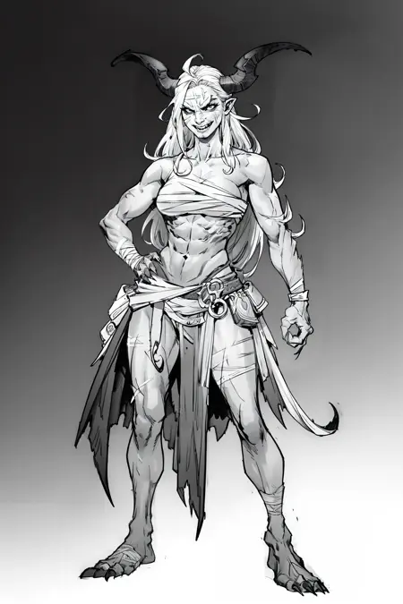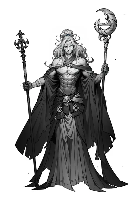 (手が丁寧に描かれた)、(指が丁寧に描かれた)、(明確な顔)、(明確な目)、パワフルなポーズ、両手を広げた、1人の少年、モノクロ、単体、長い髪、傷、包帯、筋肉質、武器を握っている、杖を握っている、白い背景、立っている、ユニコーンの角、モンスター、超高精細、8k、傑作、(テキストなし)、名前なし、(全身)、(カウボーイショット)