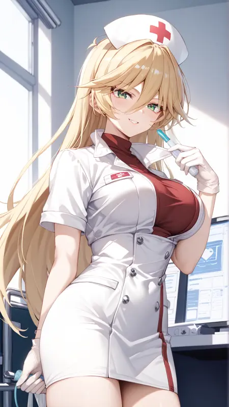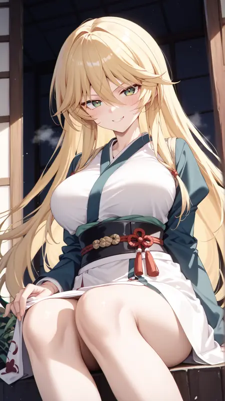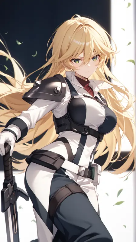Appearance:green eyes,tsurime,blonde hair, hair between eyes, large breasts,
