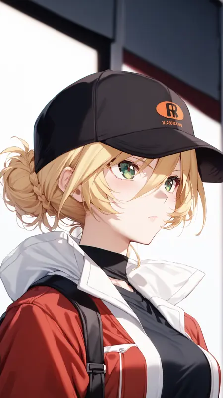 Outfit:hat, baseball cap,black headwear,red_jacket,white shirt,
