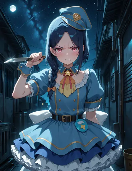 蓝色帽子, 分离式衣领, 星星胸针, 颈部丝带, 领结, 蓝色连衣裙, 短衬裙, 腰带, 按钮徽章, 背部蝴蝶结, 手腕束带