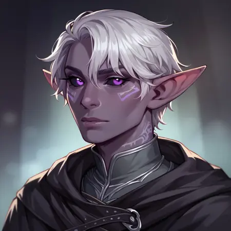 例: drow, dark elf, pointed ears, white elven tattoos, black sclera, 1girl, white hair, blue eyes,