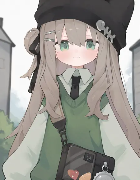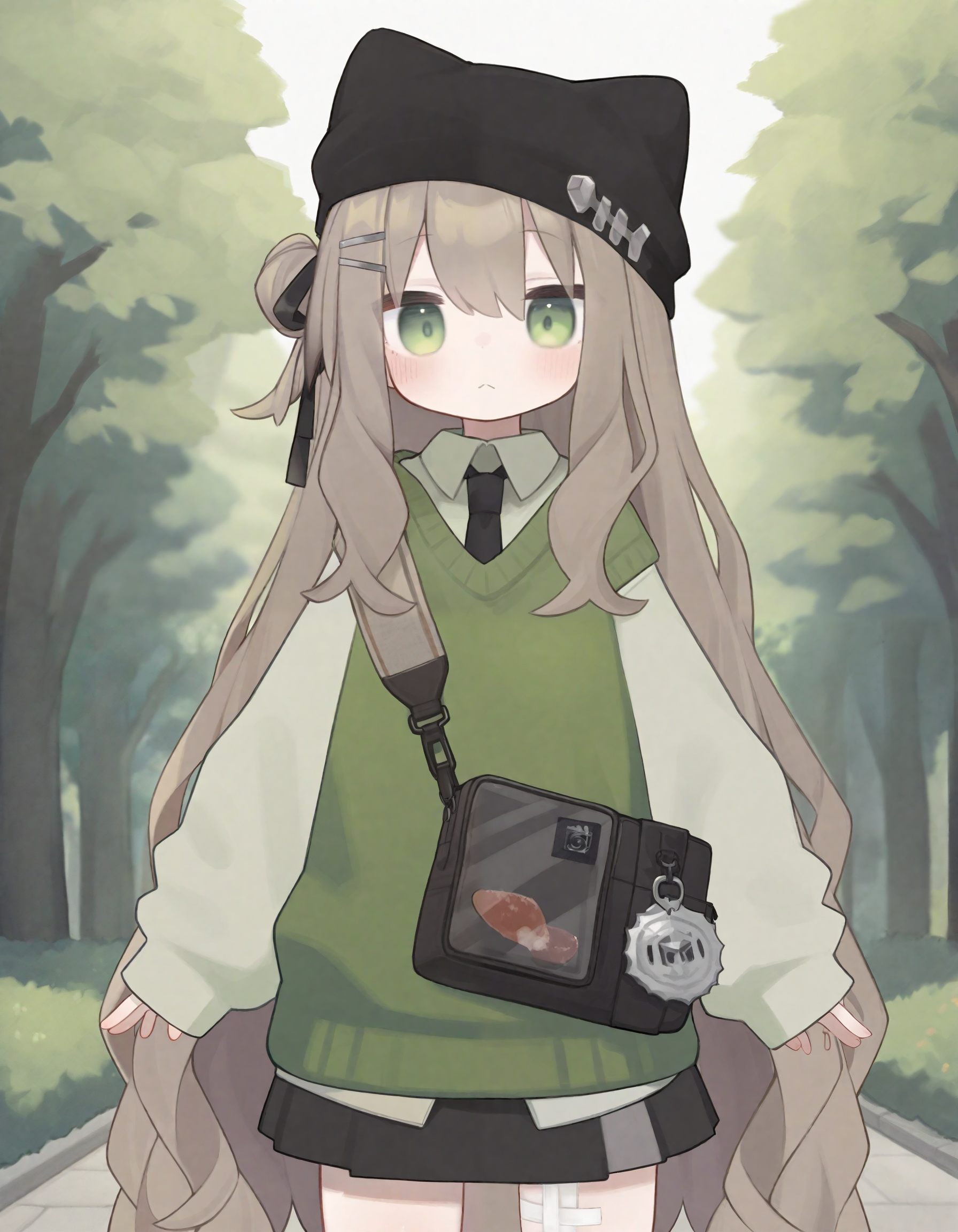 프롬프트: kipfel-vrchat, 1girl, solo, long hair, green eyes, hair ornament, long sleeves, collared shirt, black skirt, black headwear, black footwear, brown hair, black socks, black necktie, hair bun