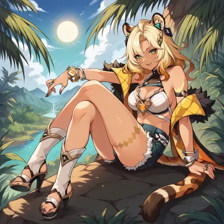 Xilonen、長い髪、金髪、編み込み、緑の目、動物の耳、虎の尾、多色の髪、肌の黒い女性、