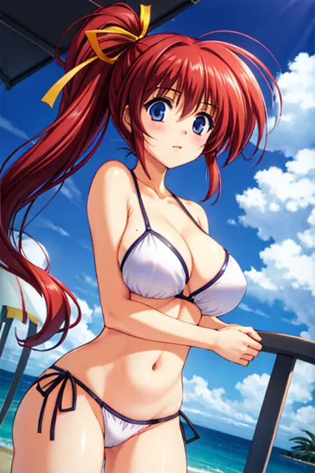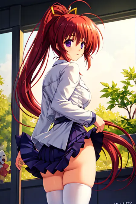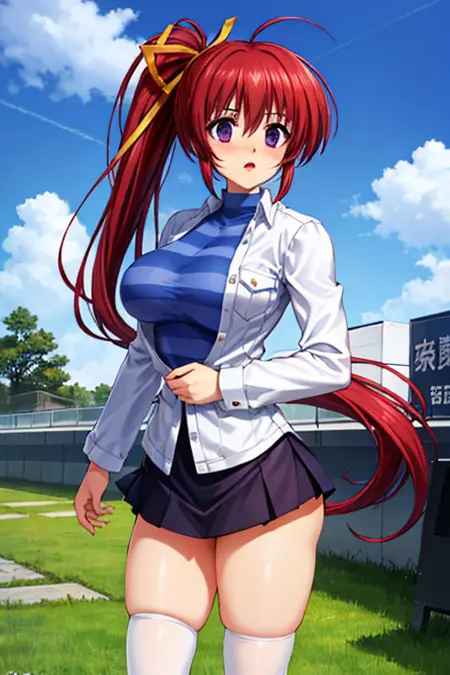 mizuki_takase,comic_party,white jacket, striped Tshrit,white high socks,red_hair, hair_ribbon,one_side_pony_tail,purple_eye, large breast,19 year old girl,white_high_ socks,zettai ryouiki, thighhighs, skindentation,ahoge,one pony tail,thick thighs,blue_skirt,