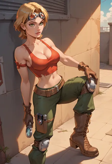 outfit tags: tank top, orange top, crop top, cleavage, navel, midriff, gloves, brown gloves, armlet, belt, pants, green pants, knee pads, boots, headband,goggles, goggles on head,