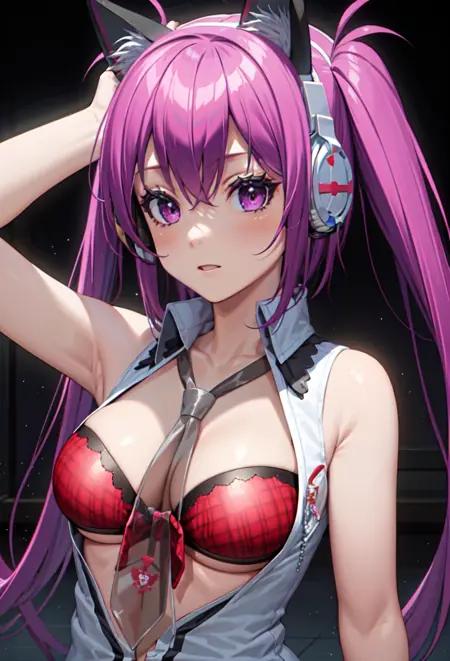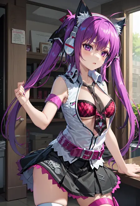 敞开式服装:白色衬衫,红色无肩带文胸,敞开的衬衫,领带,猫耳,耳机,腰带,黑色短裙,大腿绑带