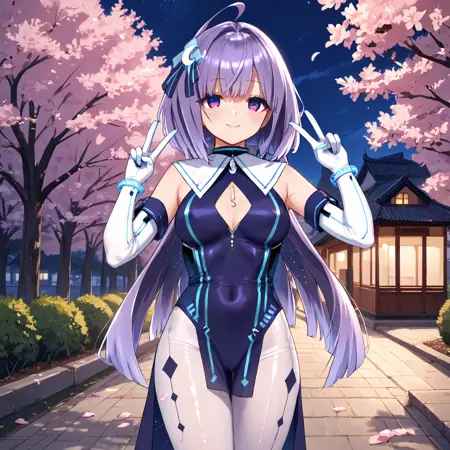 Magical Girl Uniform : serenoxia, purple eyes, purple hair, multicolored hair, long hair, ahoge, magical girl, blue leotard, crescent hair ornament, cleavage cutout, covered navel, elbow gloves, white gloves, bracelet, detached sleeves, white pantyhose,