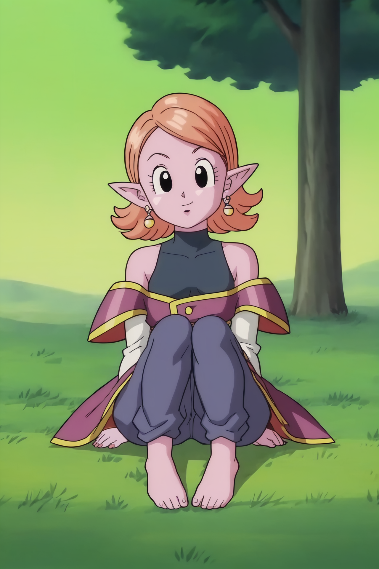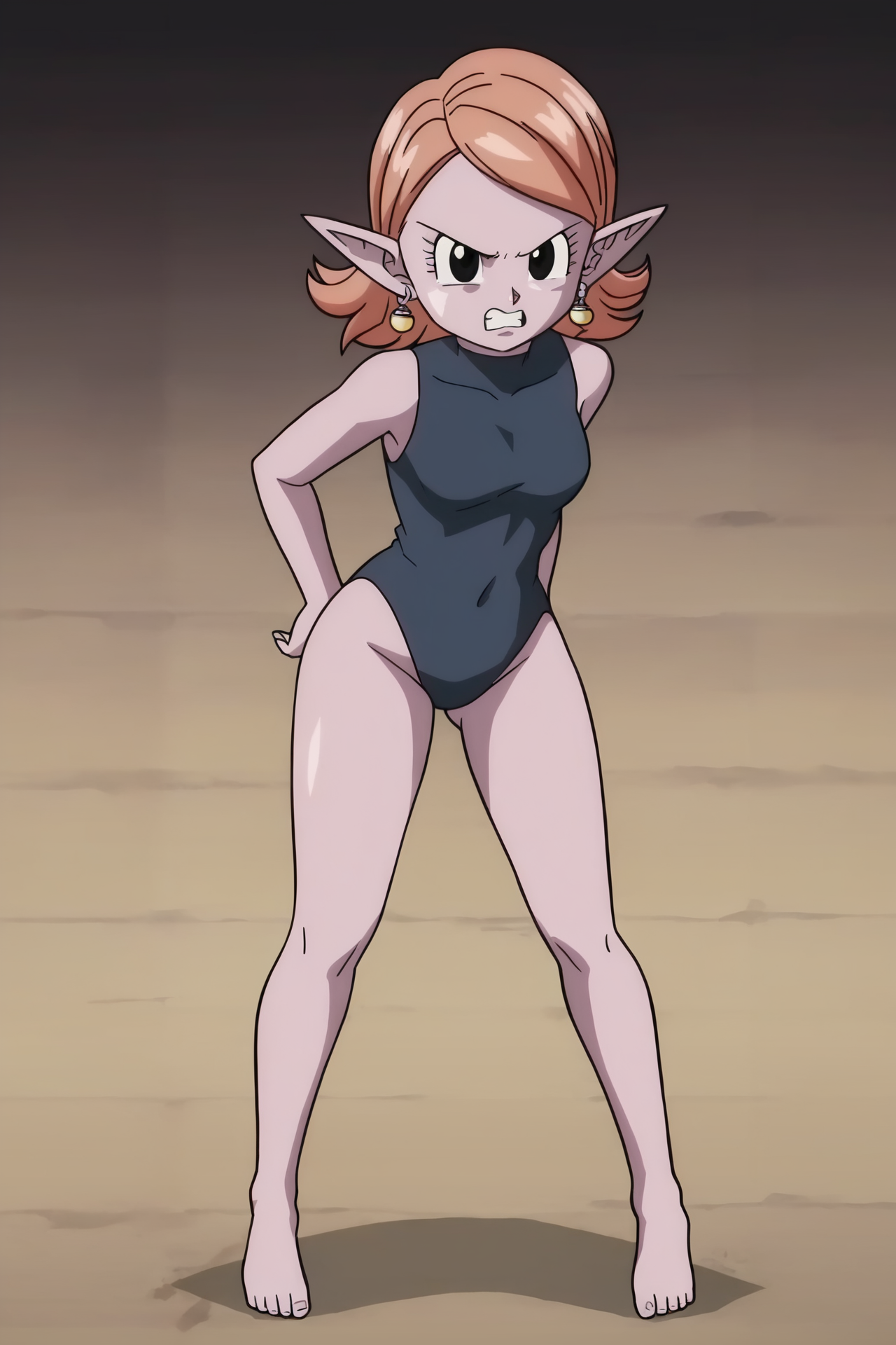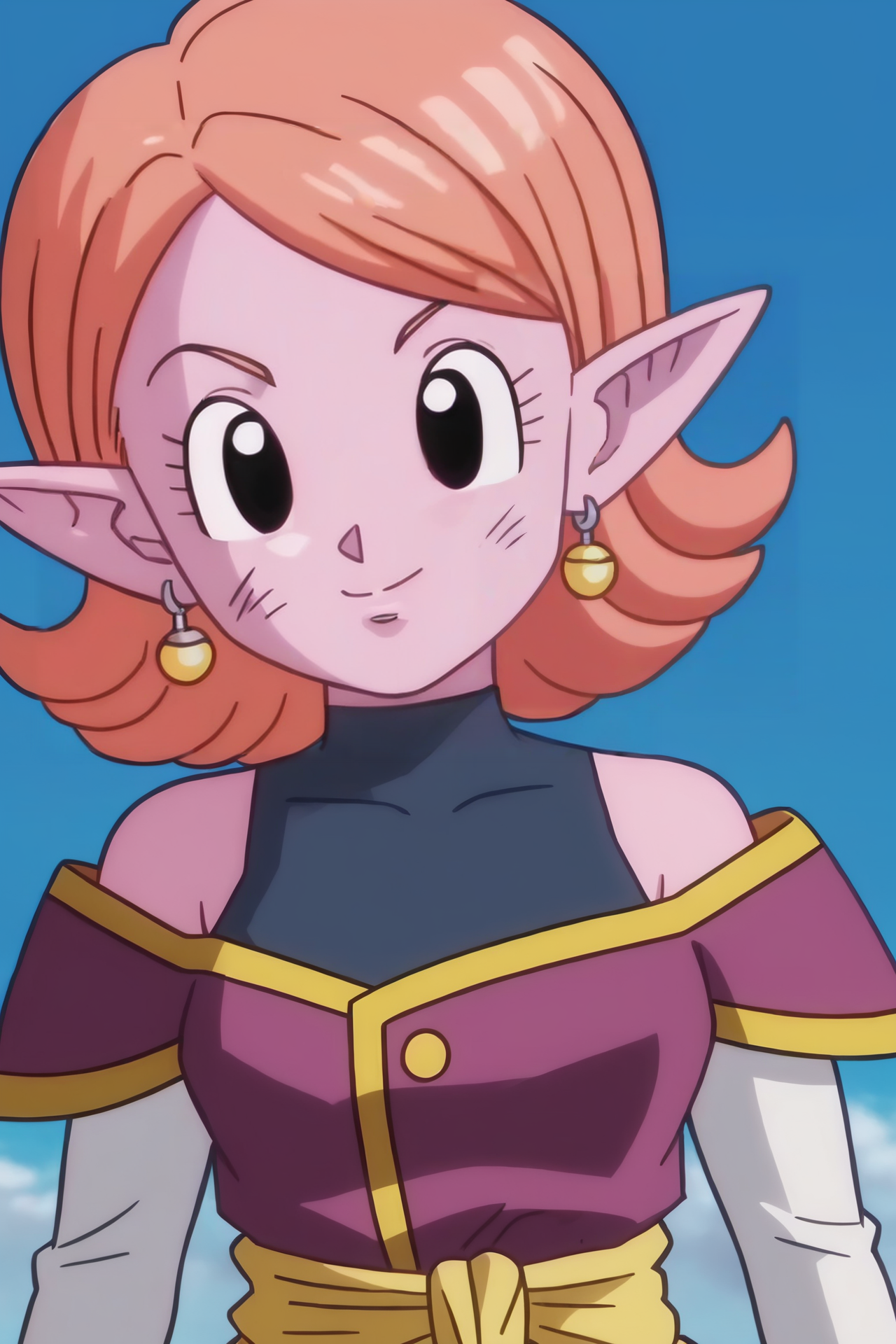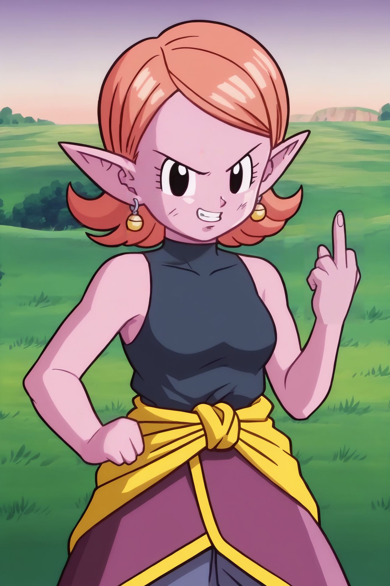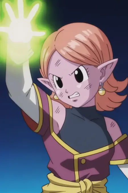 chronoa, potara earrings, orange hair, pointy ears, black eyes, colored skin, purple skin,