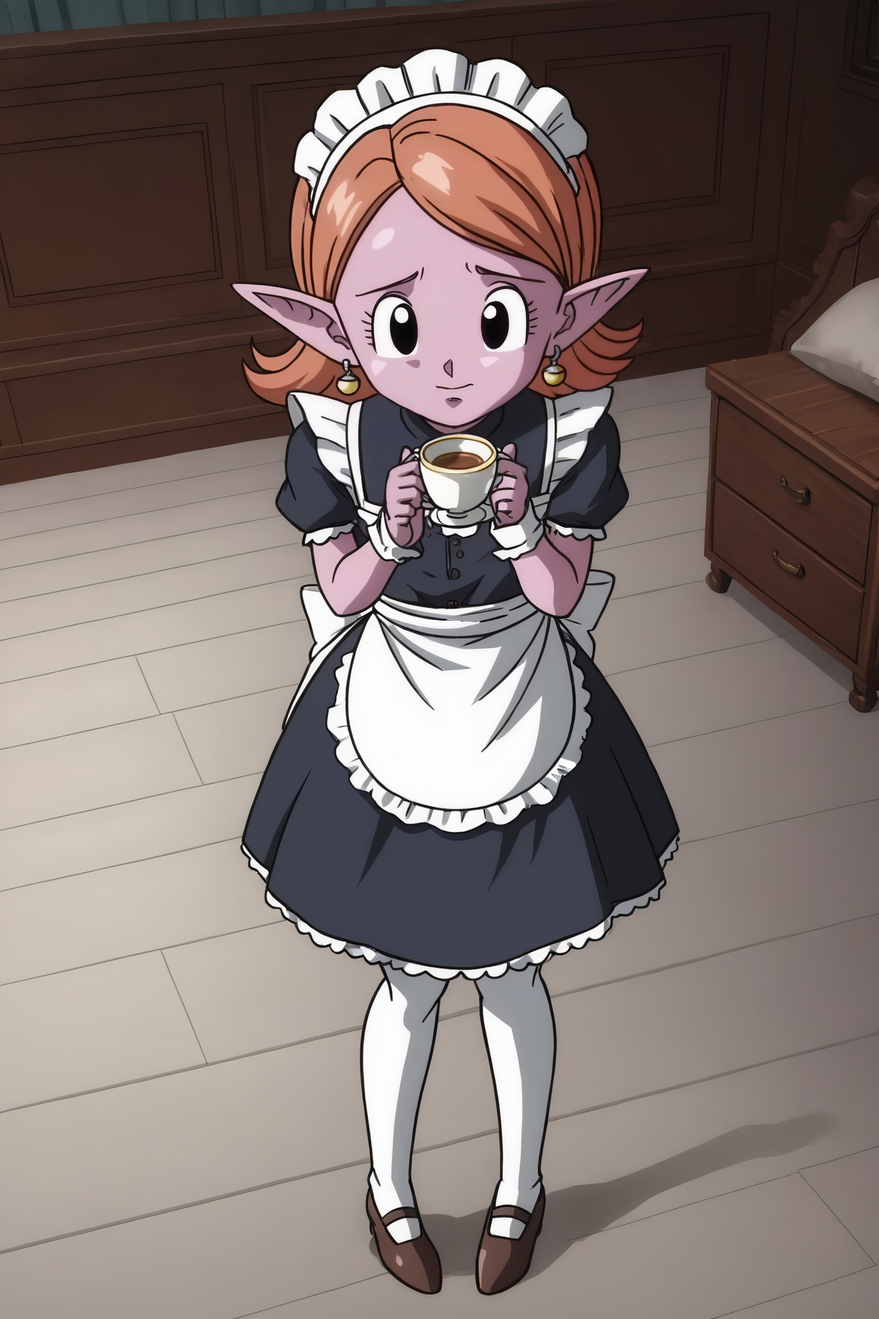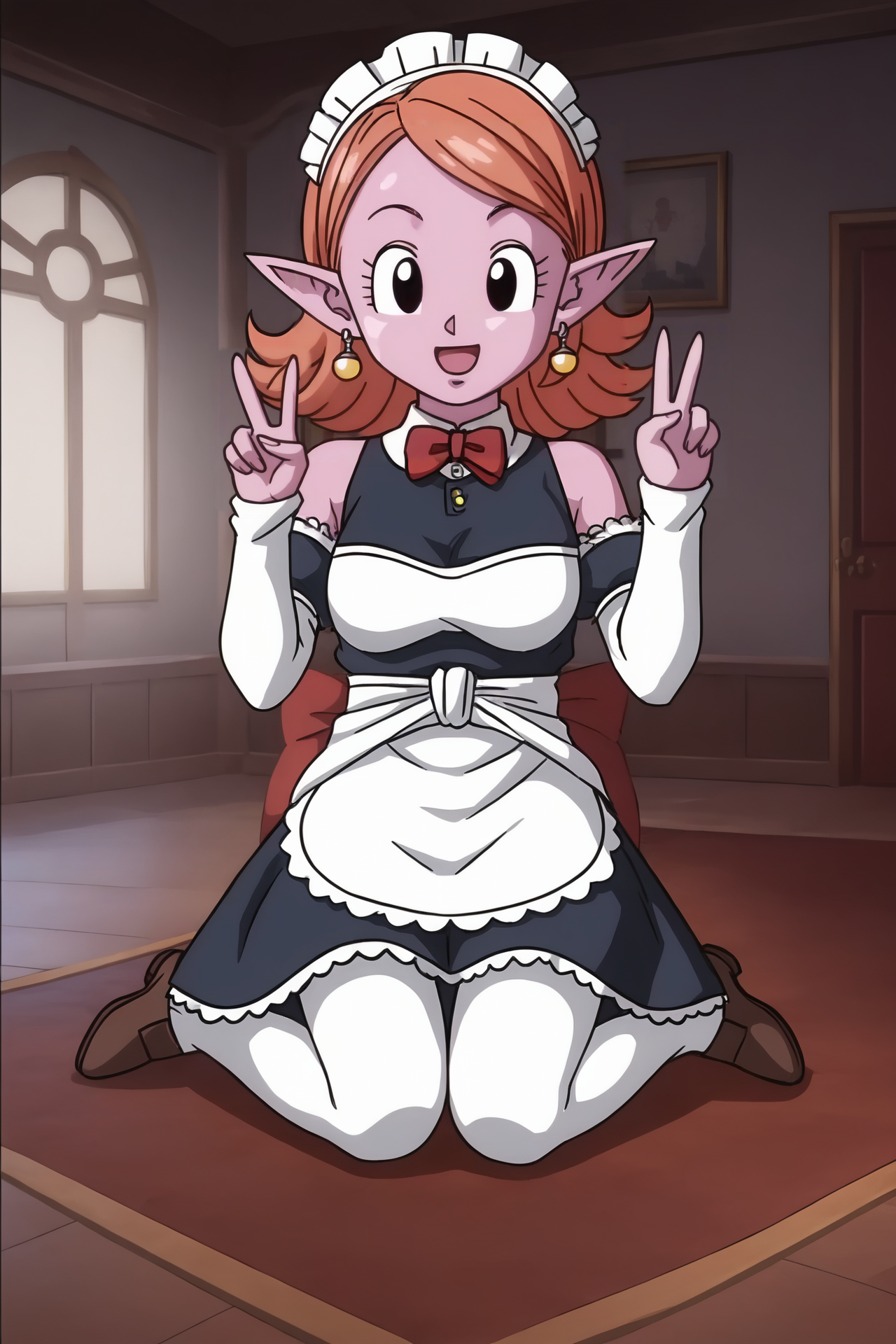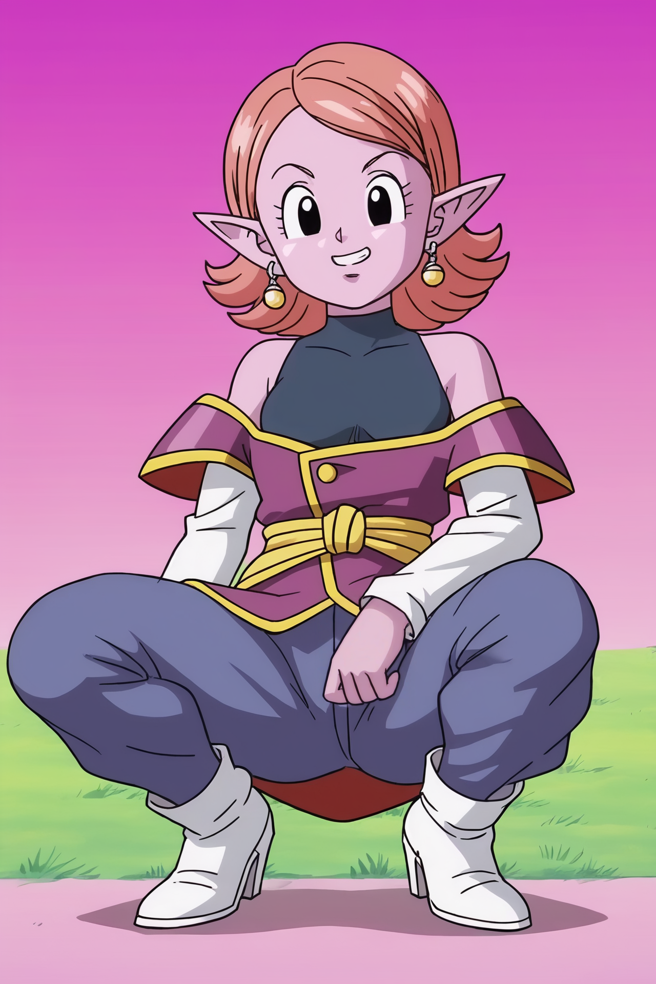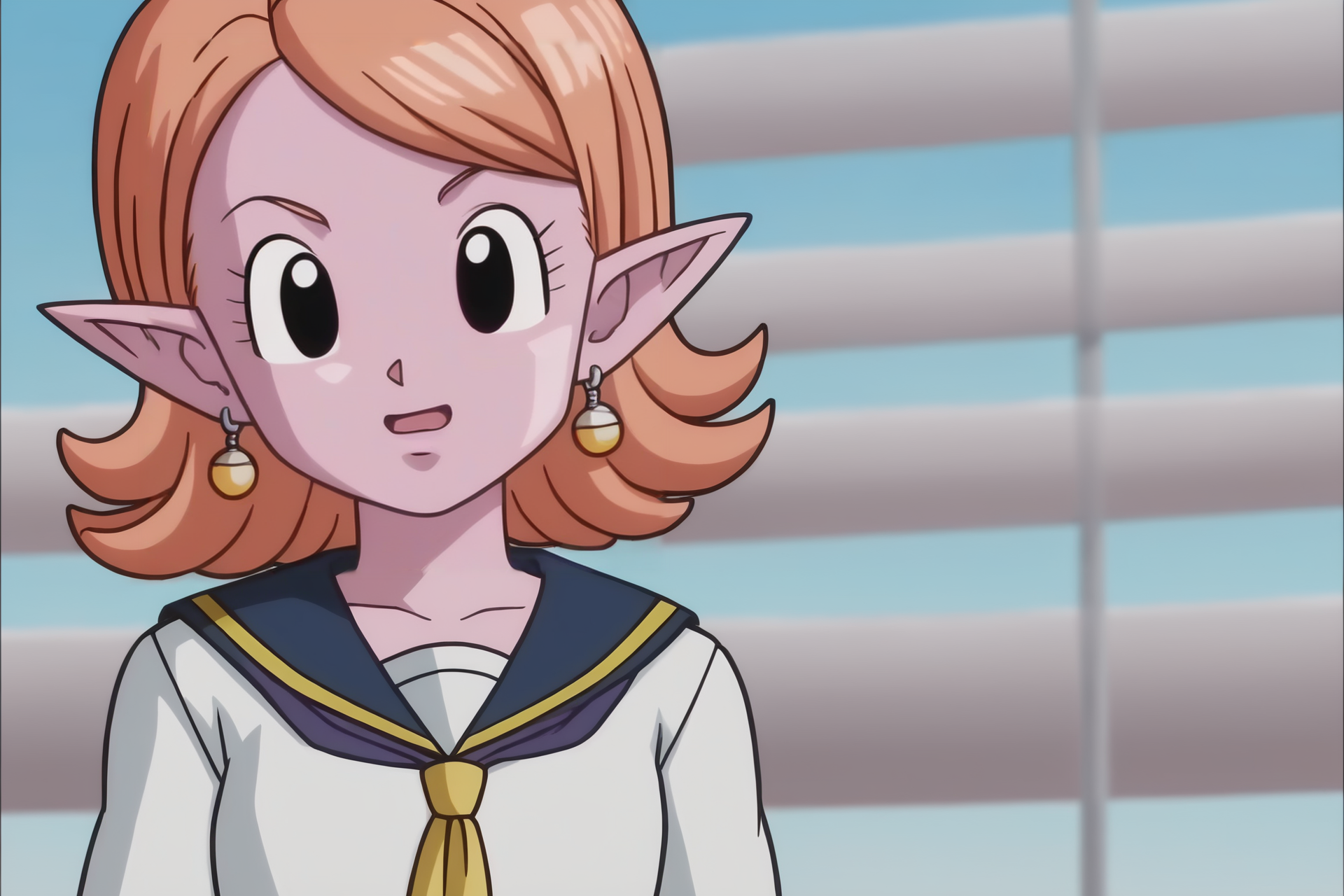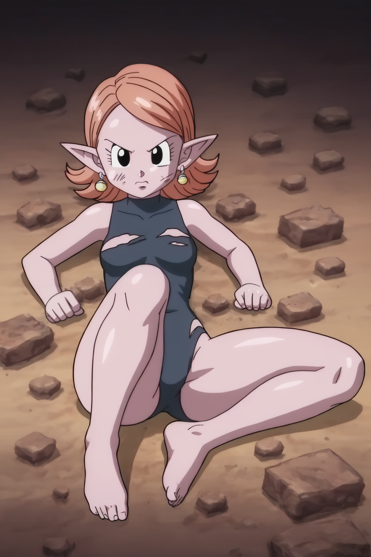 chronoa, potara earrings, orange hair, pointy ears, black eyes, colored skin, purple skin,