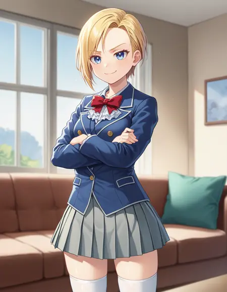 school uniform, blue jacket, red bow, frilled bow, grey skirt, pleated skirt, white thighhighs
