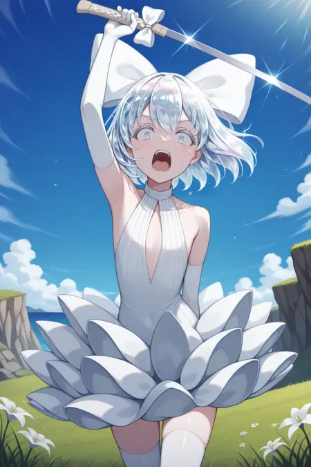 服装3:发带蝴蝶结,白色蝴蝶结,白色连衣裙,花朵装饰,芭蕾舞裙,服装镂空,中央开口,无袖,肘部手套,白色手套,白色过膝袜