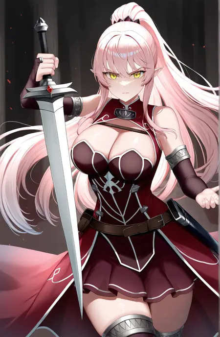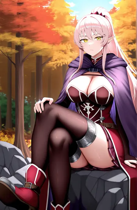아리안, 드레스, 보라색 망토, 손가락 없는 장갑, 허벅지까지 오는 양말, 미니스커트, 부츠