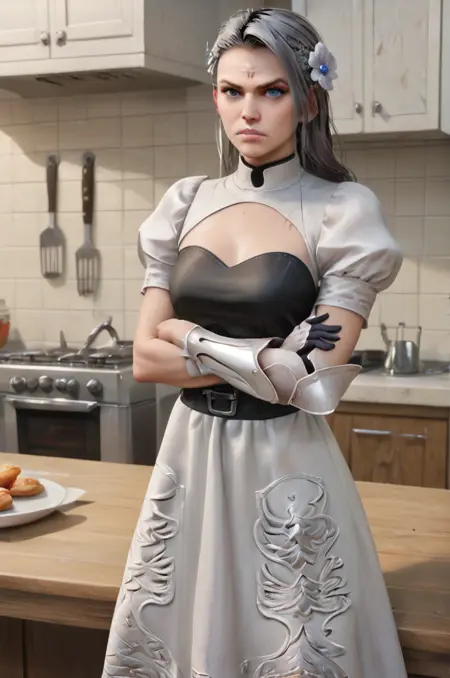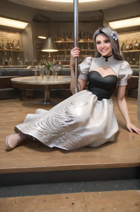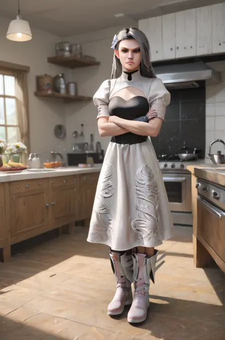 복장 프롬프트: 흰색 드레스, 검은 가슴, 흰색 부츠