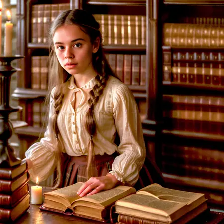 1boy, 1girl, ascot, beard, black hair, black robe, black-framed eyewear, blonde hair, blurry, blurry background, blurry foreground, book, book stack, bookshelf, braid, breasts, brown eyes, brown hair, candle, candlelight, candlestand, chair, cleavage, coat, dark, dark skin, dark-skinned female, dark-skinned male, depth of field, desk, dreadlocks, earrings, facial hair, fire, food, formal, freckles, fruit, glasses, grey hair, grin, headband, holding, indoors, jewelry, librarian, library, lips, long hair, long sleeves, looking at viewer, male focus, mustache, necklace, necktie, old, old man, old woman, open book, open mouth, paper, reading, realistic, robe, scenery, school uniform, shadow, shirt, short hair, sitting, skirt, smile, solo, stubble, suit, sunglasses, table, tattoo, twin braids, very dark skin, vest, white hair, window