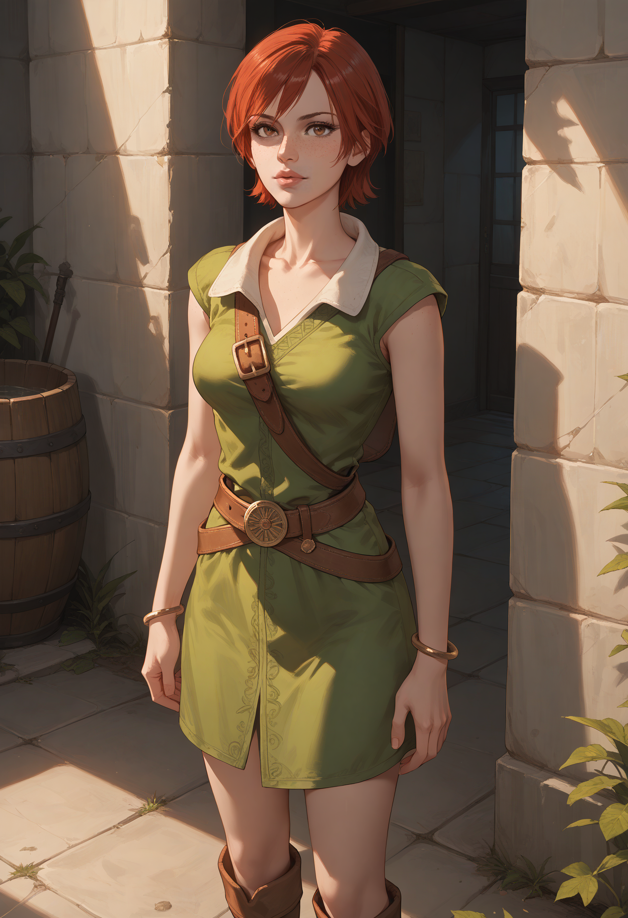 recommended tags: 1girl, solo, red hair, short hair, brown eyes, freckles, medium breasts, lips,