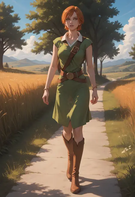 outfit tags: dress, green dress, tunic, belt, jewelry, strap between breasts, bracelet, boots, brown footwear, short sleeves, sleeveless, collarbone,