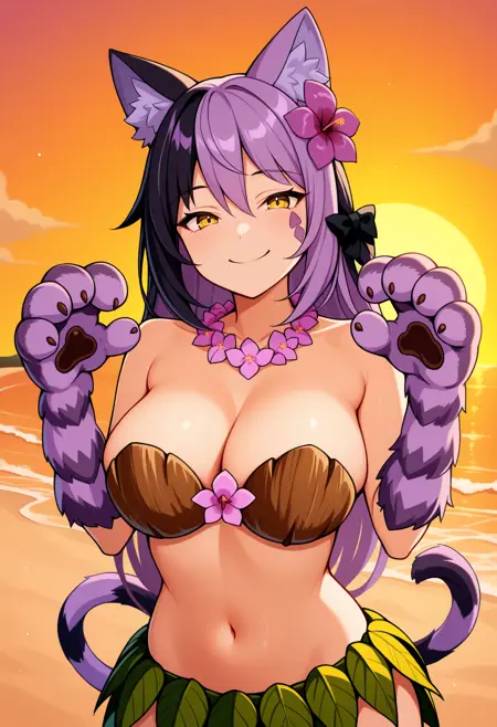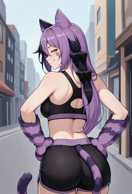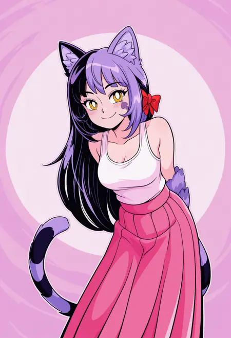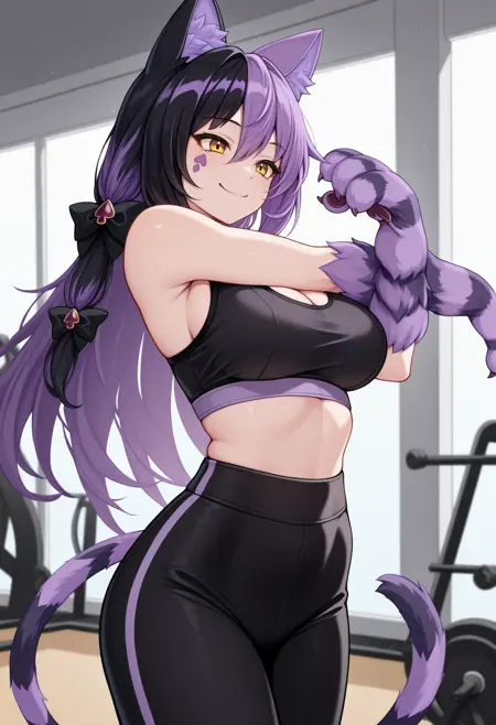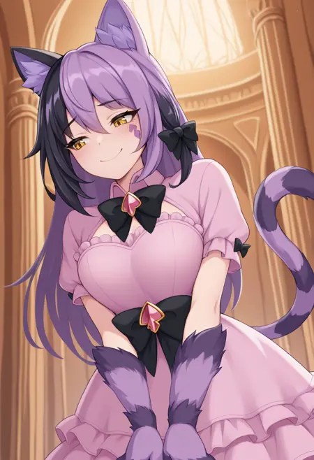 CheshireMGE, 黄色眼睛, 多色头发, 黑色头发, 紫色头发, 长发, 发饰蝴蝶结, 猫爪, 面部标记, 条纹尾巴