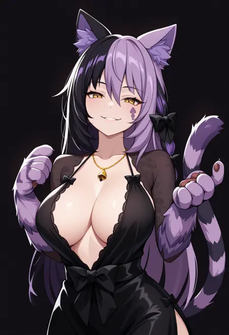 CheshireMGE, 노란 눈, 다색 머리카락, 검은 머리카락, 보라색 머리카락, 긴 머리, 머리 리본, 고양이 발바닥, 얼굴 무늬, 줄무늬 꼬리, 분리형 목걸이, 검은 링크, 목걸이 종, 흉부 노출, 분리형 소매, 아르글레이 소매, 보라색 드레스, 주름, 짧은 드레스, 아르글레이 허벅지 양말, 검은 신발, 하이힐