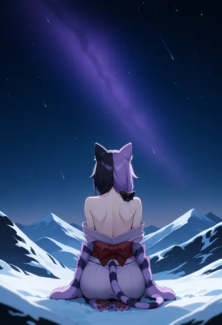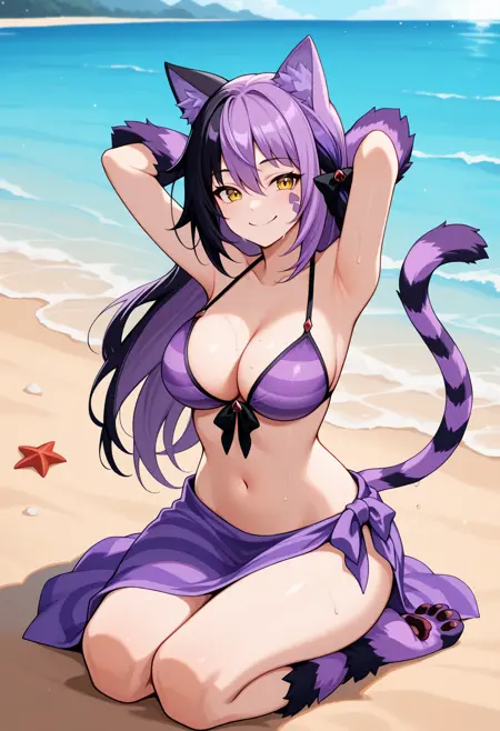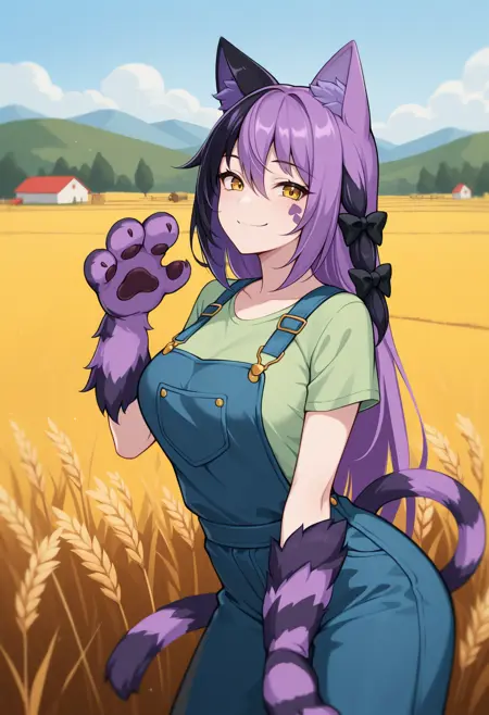 CheshireMGE, 노란 눈, 다색 머리카락, 검은 머리카락, 보라색 머리카락, 긴 머리, 머리 리본, 고양이 발바닥, 얼굴 무늬, 줄무늬 꼬리