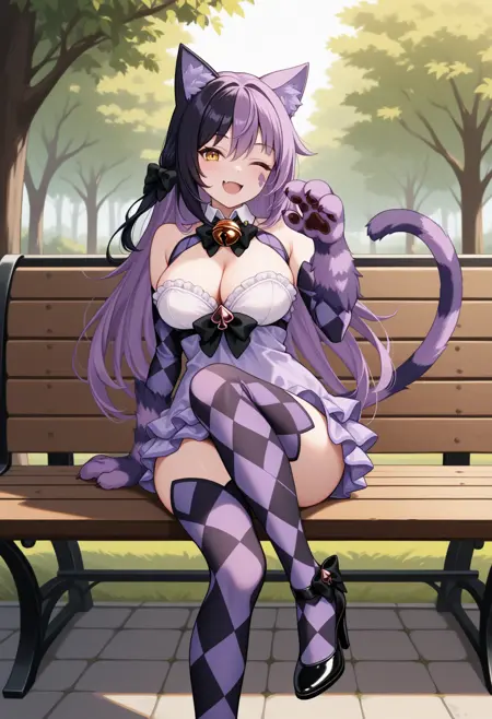 CheshireMGE, 黄色眼睛, 多色头发, 黑色头发, 紫色头发, 长发, 发饰蝴蝶结, 猫爪, 面部标记, 条纹尾巴, 分离式衣领, 黑色领结, 颈部铃铛, 暴露胸部, 分离式袖子, 格子袖子, 紫色连衣裙, 荷叶边, 短裙, 格子长筒袜, 黑色鞋履, 高跟鞋