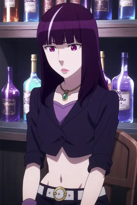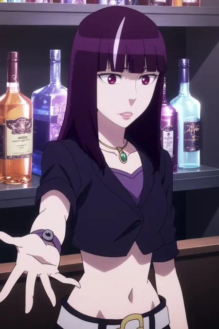 触发词:chiyuki,1girl,solo,long hair,blunt bangs,bangs,jewelry, necklace,lipstick,streaked_hair, multicolored_hair, lips,parted_lips, midriff,purple hair,turtleneck, belt