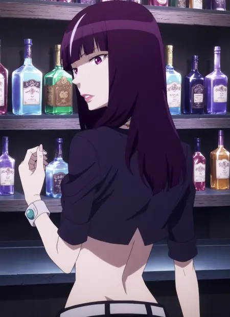 触发词:chiyuki,1girl,solo,long hair,blunt bangs,bangs,jewelry, necklace,lipstick,streaked_hair, multicolored_hair, lips,parted_lips, midriff,purple hair,turtleneck, belt