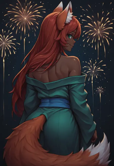 トリガー+外見: z00logist, 暗い肌の女性、狐の尾、長い髪、赤い髪、動物の耳、動物の耳のふわふわ、大きな胸