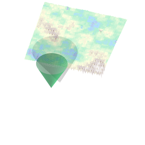 プロンプト:「サイズ0.82の円錐オブジェクトで、RGB(174, 140, 149)で塗られ、座標(X: 0.41, Y: 1.62, Z: -0.75)に配置されています。オブジェクトはヨー: 197.78°、ピッチ: 137.22°、ロール: 263.72°で回転し、ワイヤーフレームスタイルで透明度0.5で表示されます。環境は'perlin'、レイヤリングは有効でレイヤー数は2です。影は有効です。」