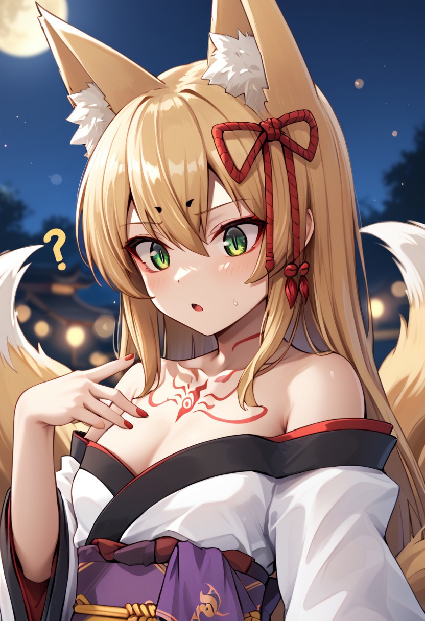 타마모, 금발, 헤어 리본, 긴 머리, 키테츠, 녹색 눈, 여우 귀, (여우 꼬리), (빨간 아이라인), 어린 소녀, 몬스터 걸, 수직 동공, 여러 개의 꼬리, 가슴의 빨간 문신, 기모노, 어깨 드러남, 띠