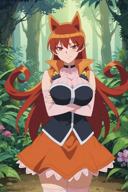 Triggers : azazel ameri,1girl,solo,mature,looking at viewer,animal ears, red hair,bangs,pointy ears,long hair,hair horns,smile,choker,breasts,large breasts,detached sleeves,skirt,thighhighs