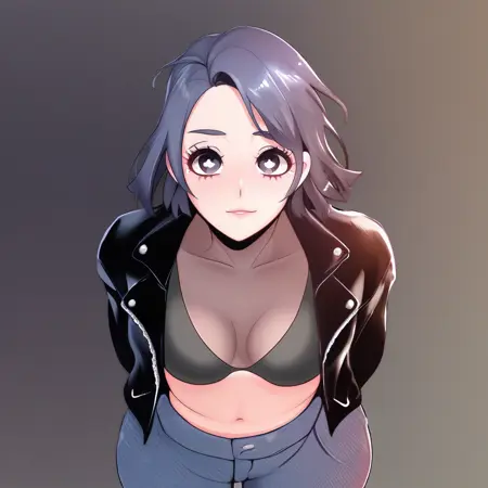 1. ((sexy beautiful open black leather jacket, sexy beautiful long-sleeves sheer black top, black bra, denim trousers, )) + red high-heels, black panties,