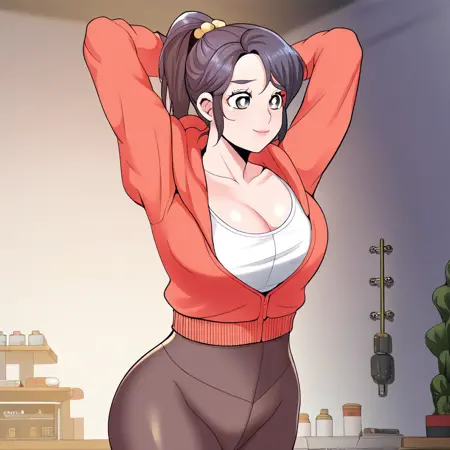3. ((red fleece hoodie, white top, huge cleavage, obscene cleavage, dark grey training tights, ))