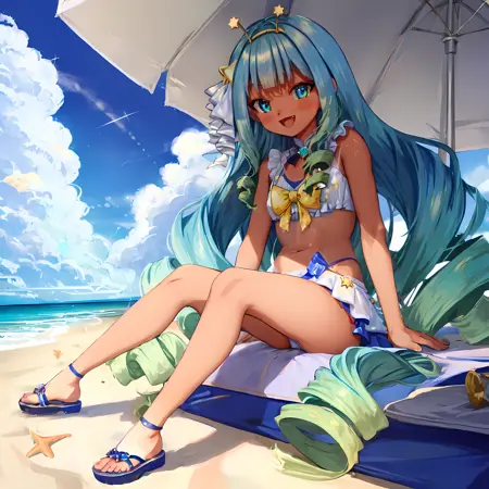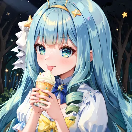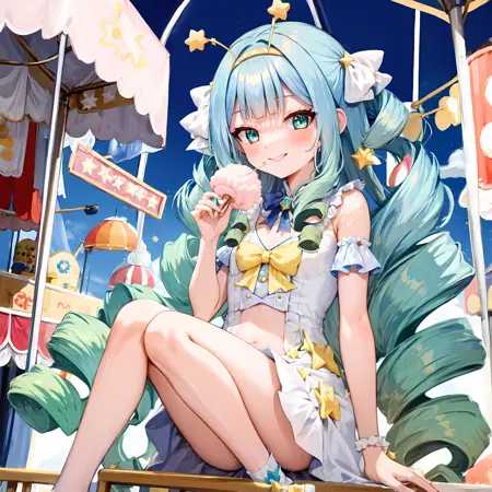 jelly hoshiumi, 1girl, solo, blush, smile, blue eyes, very long hair, blue hair, small breasts, (drill hair, blunt bangs, green hair), star (symbol), gradient hair, antennae, yellow bow, star hair ornament, yellow hairband, hair ornament