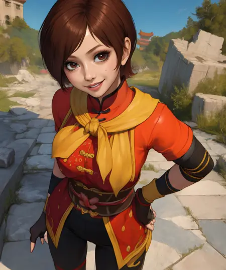fingerless gloves, elbow pads, red ribbon belt, black pants, - polka dot Chinese clothes, or polka dot vest, red Chinese clothes, -- yellow neckerchief, or yellow scarf,