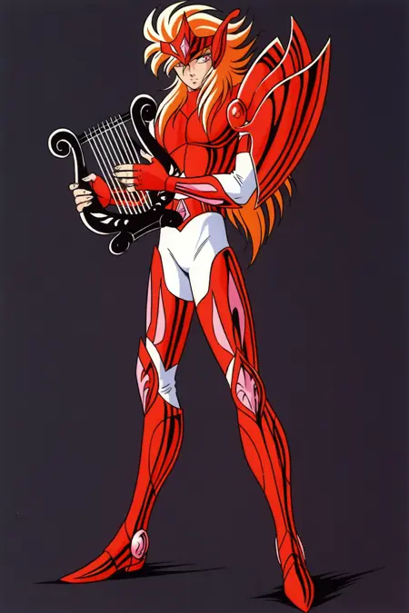 long wavy orange hair, slender figure, red circlet, pink eyes, red armor, red pauldrons, white sleeves, red vambraces, red fingerless gloves, red belt, white pants, red greaves, holding harp