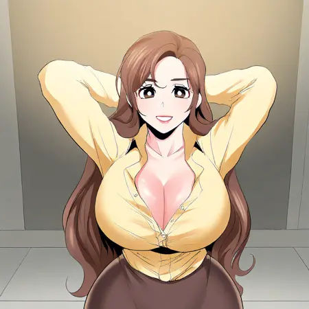 10. ((美丽的长袖黄色衬衫,巨大乳沟,露骨乳沟,黑色铅笔裙,))