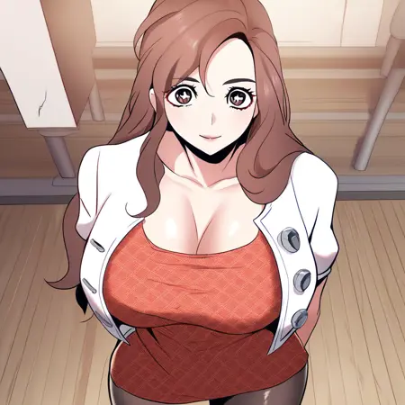 ((아름다운 긴 소매 노란 상의, 거대한 젖가슴, 저속한 젖가슴, 주황색 펜실 스커트, ))