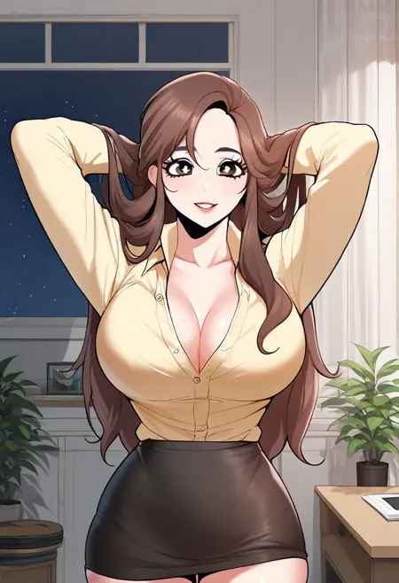 ((아름다운 긴 소매 노란 셔츠, 거대한 젖가슴, 저속한 젖가슴, 검은 펜실 스커트, ))