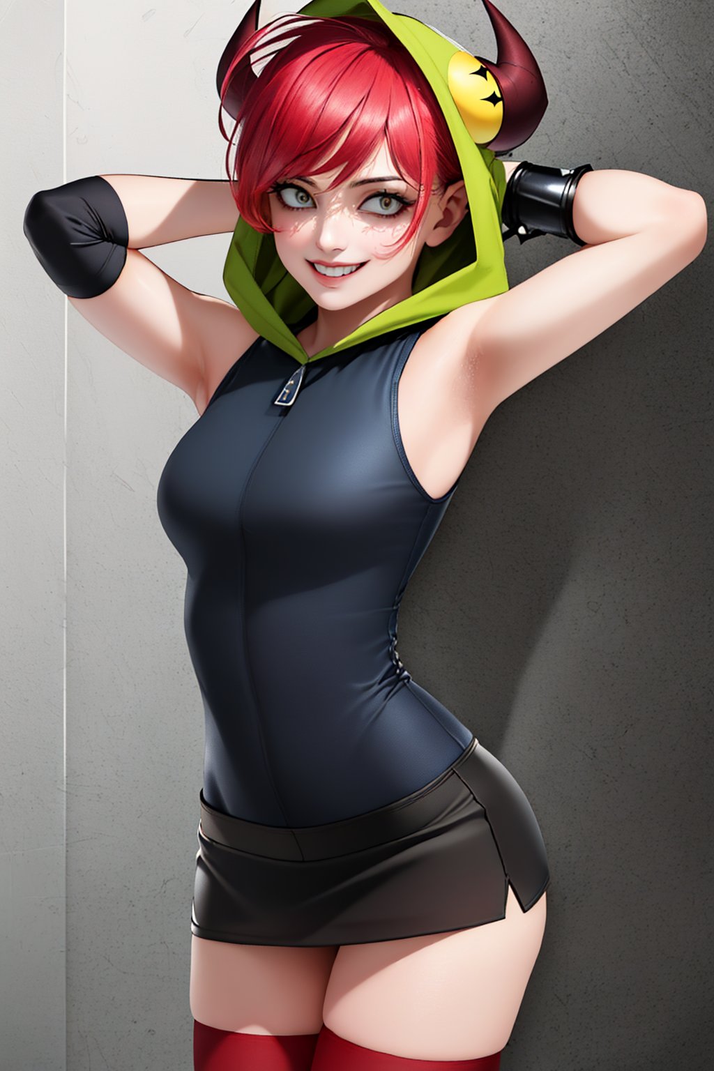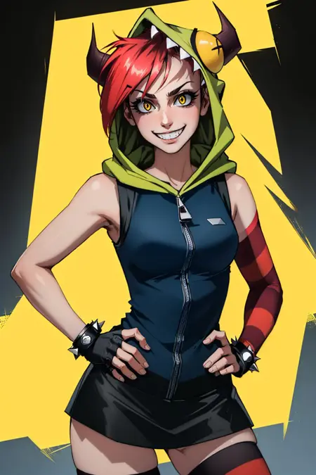 Default Outfit: striped, vest, sleeveless, hood, horns, thighhighs, fingerless gloves, jewelry, bracelet, spikes