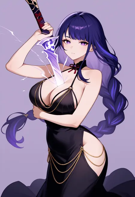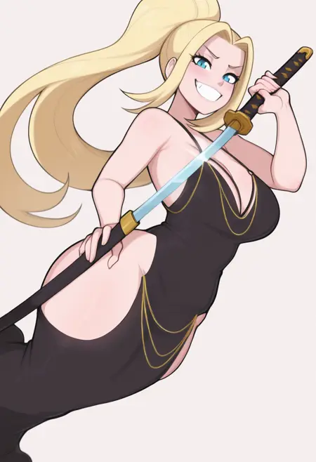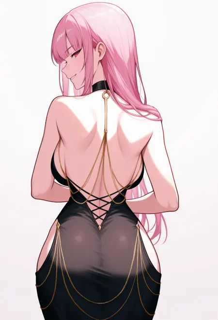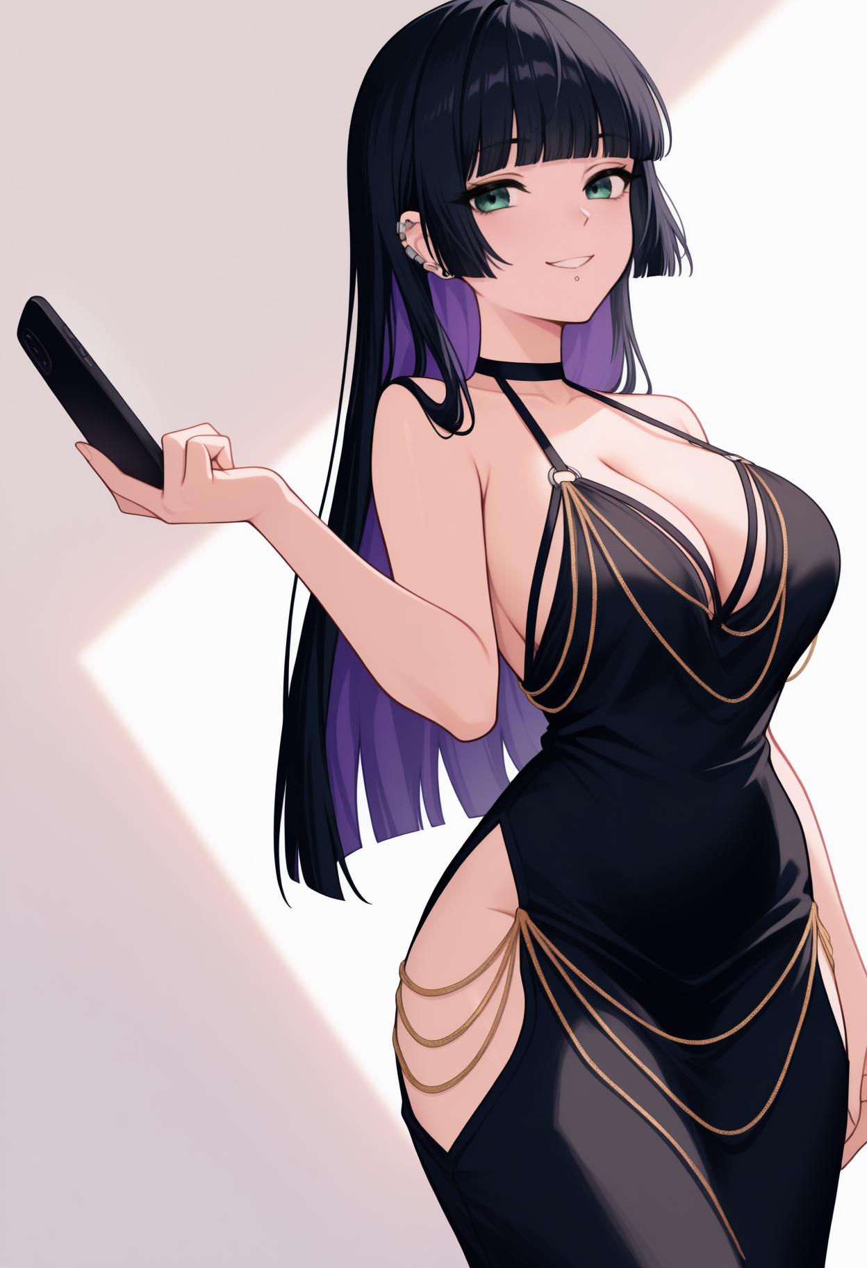 トリガー+追加タグ: modakawa, long dress, black dress, sleeveless dress, hip vent, gold chain, bare shoulders, cleavage