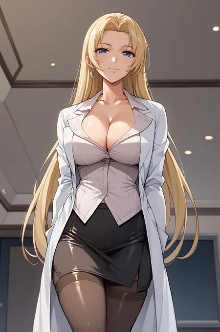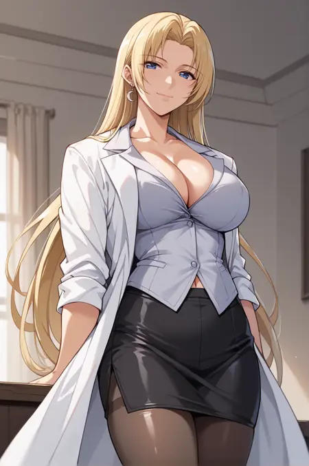 乳沟,大乳房,蓝眼睛,黑色短裙,肚脐,铅笔裙,丝袜,迷你裙,白衬衫,内衣,白色实验服,无胸罩,过膝袜