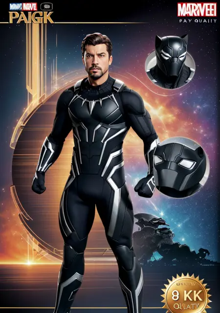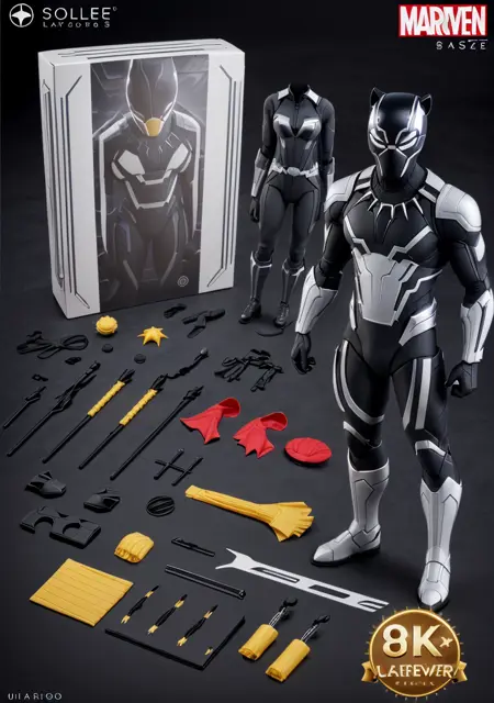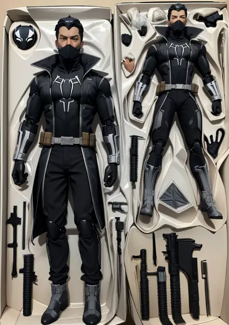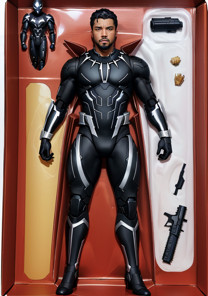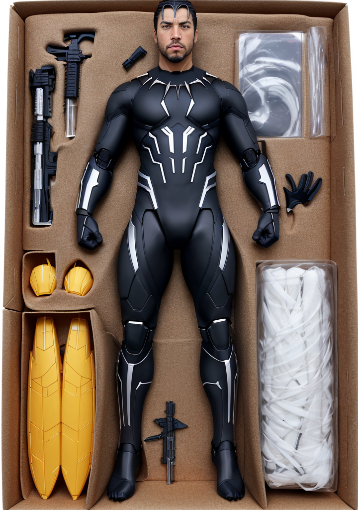 (best quality:1.15), (masterpiece:1.15), (detailed:1.15), (realistic:1.2),premium playset toy box, (8k, ultra quality, masterpiece:1.5), (Dutch angle:1.3), ActionFigureQuiron style, solo, Black Panther (Marvel Comics): Black Panther's sleek black suit is made of a vibranium-infused material and features intricate silver detailing. The suit includes a full-body jumpsuit, clawed gloves, and a mask with cat-like ears. , (plastic toy playset pack), inside gift box,lora:quiron\_ActionFigure\_v2\_Lora:0.95