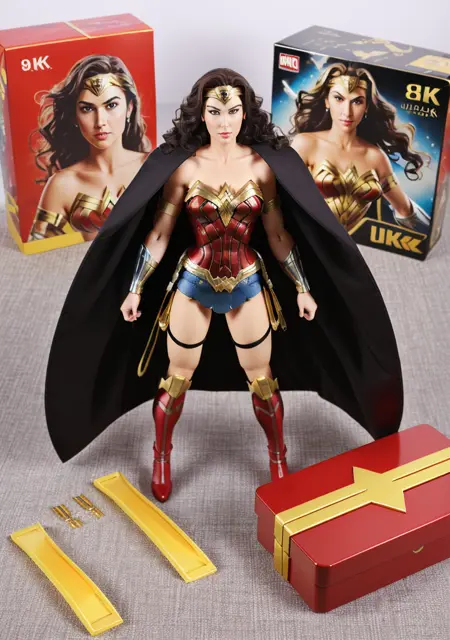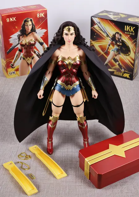(Dutch angle:1.3), (ActionFigureQuiron style), solo, Wonder Woman (DC Comics): Wonder Woman's iconic armor, tiara, and Lasso of Truth make her a powerful and empowering character to cosplay , action figure box, weapon, wings, high heels, no humans, (reference sheet:1.4), power armor,