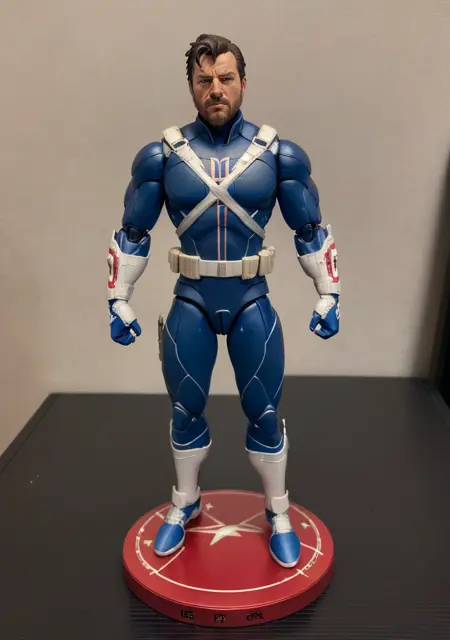 (8k, ultra quality, masterpiece:1.5), (Dutch angle:1.3), ActionFigureQuiron style,action figure box, solo, 1boy, standing, male focus, armor, copyright name, helmet, logo, lora:quiron\_ActionFigure\_v2\_Lora:0.5