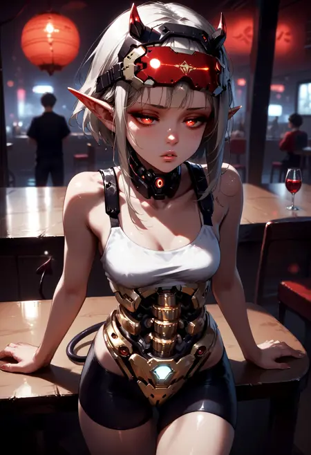 Featuring Ana’s signature wolf ears or elf ears (but not human ears—rules matter!) with platinum bobbed hair, glowing red cybernetic eyes, and a confident presence ready for action.High-Quality Outputs: