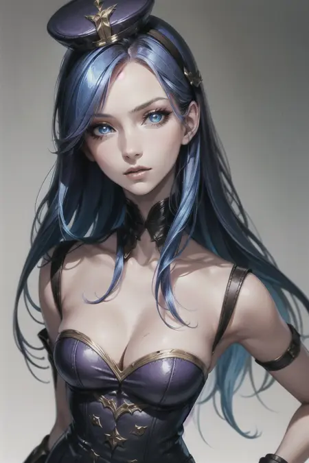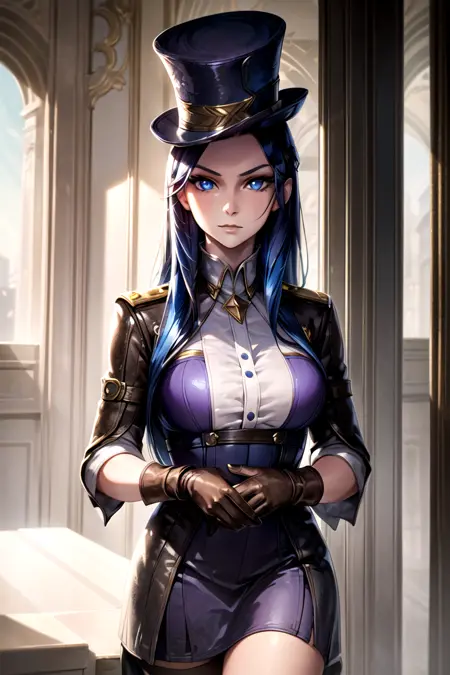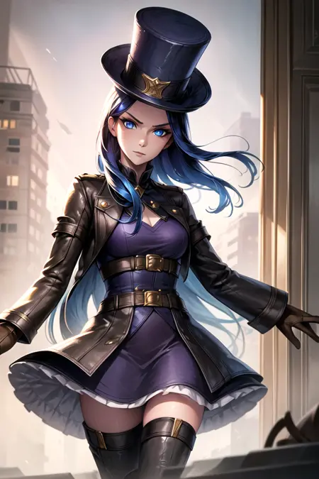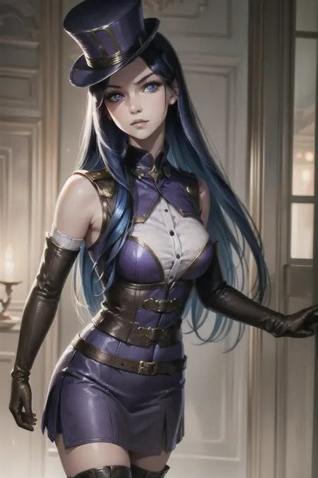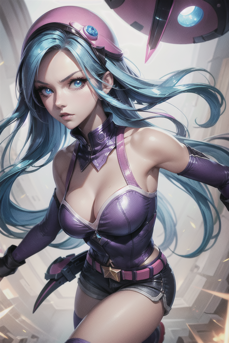 arcane caitlyn, purple jumpsuit, brown leather girdle, cleveage, knee boots, purple nails