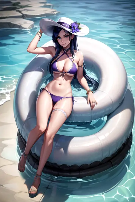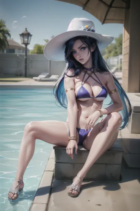 pool party caitlyn, white hat, purple bikini, front-tie bikini, halterneck, cleveage, bridal garter, white heels, gold bracelet