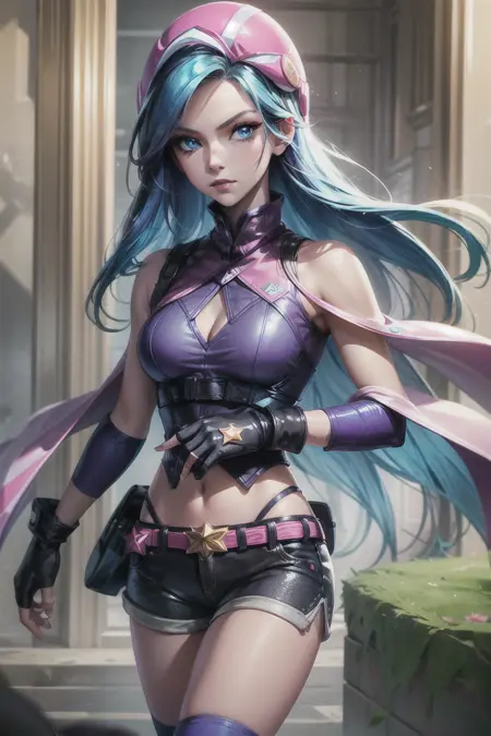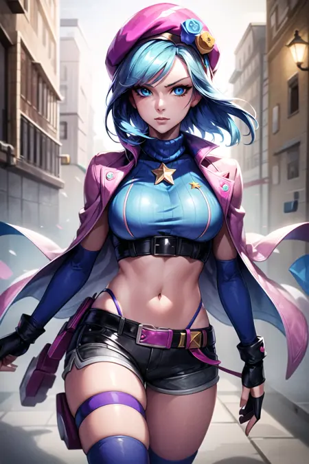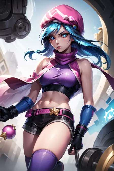 arcade caitlyn, star ornaments, light blue hair, medium hair, pink hat, purple sweater, blue mini shorts, purple gloves, pink belt, pink capelete, thighhighs