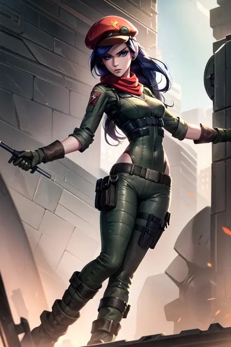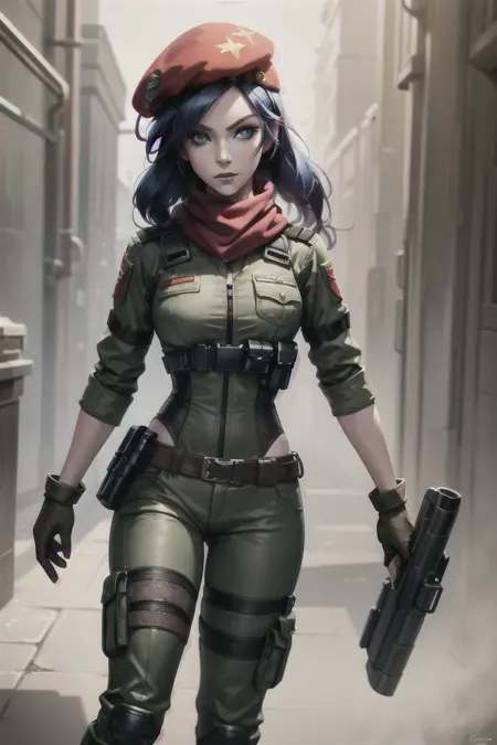 resistance caitlyn, red scarf, red hat, militar outfit, chest armor, green shirt, brown pants, knee boots, green gloves, ear intercom
